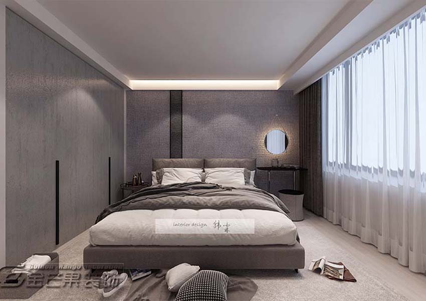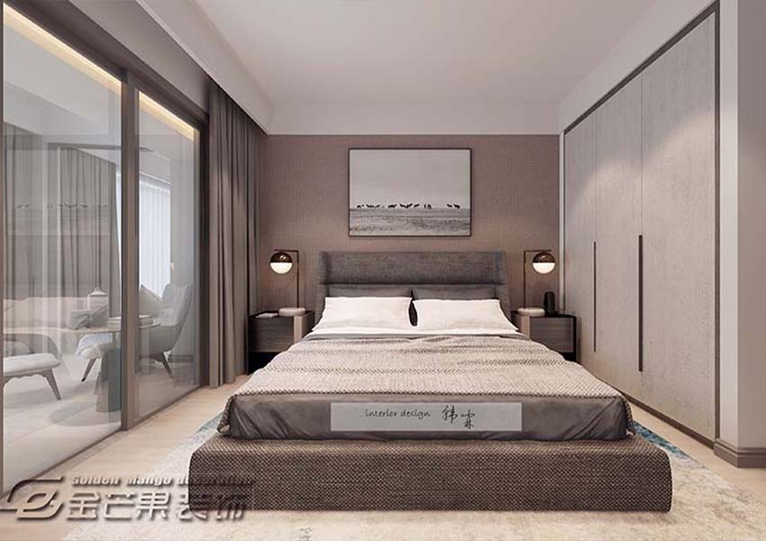 落地的玻璃推拉門隔開成臥室,在風(fēng)格上顯得開放、大方。臥室的陽臺(tái)和客廳的陽臺(tái)相互連接,生活、時(shí)尚、享受、獨(dú)一無二。臥室里透露著簡(jiǎn)與素,在色彩的運(yùn)用游刃有余。光,以床頭柜的兩個(gè)白熾燈和陽臺(tái)頂?shù)臒魩Ч饩€為主,注重休息上的體驗(yàn)。