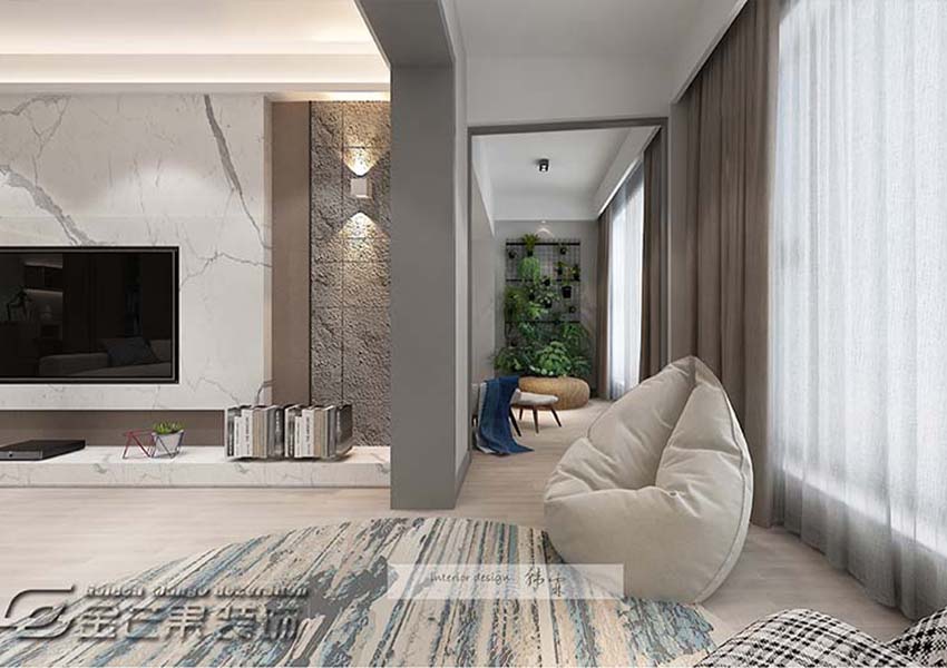 整個(gè)空間沒有主燈的設(shè)計(jì),顯得平易近人,電視機(jī)鑲嵌到墻體里面,落地的電視柜設(shè)計(jì)顯得時(shí)尚前衛(wèi)。陽臺(tái)布置兩個(gè)懶人椅,增加生活上的體驗(yàn),沙發(fā)風(fēng)格的選擇完美的契合了整體,在電視背景——大理石的作用下,整體顯得優(yōu)雅范十足。長條陽臺(tái)增添了生活樂趣的更多可能。