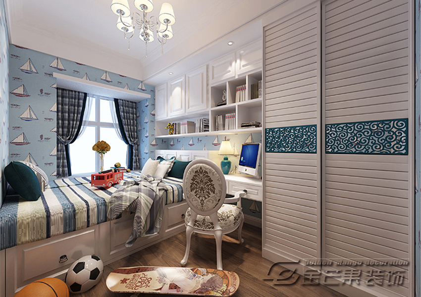 創意十足,童心滿滿。推拉門的衣柜設計,更加方便,足球、籃球、滑板,多方面培養孩子的興趣愛好,更有助于身心的健康發展。