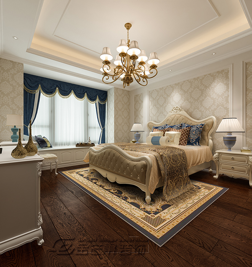 酒紅色木質地板,高貴奢華。床體是奢華的巴洛克風格。一盞吊燈尤為吸人眼球,銀色打邊的床體和柜體更顯得高貴。深藍色的窗簾,隔離著外面強烈的光線呵護著隱私。