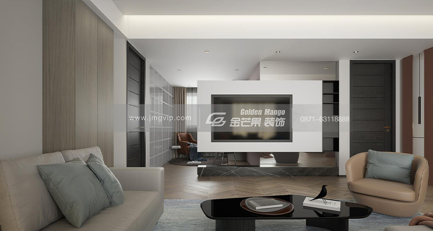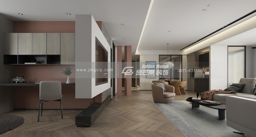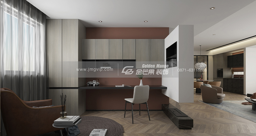 以電視背景墻巧妙隔開后面的書房、工作區(qū),淺色系的軟裝家具,也能讓浮躁的心,沉靜不少。地板拼接成紋理豐富的形狀。舍棄了吊燈、吸頂燈等主燈設(shè)計,空間上更加的統(tǒng)一、視覺更加的寬敞,燈光上顯得柔和。