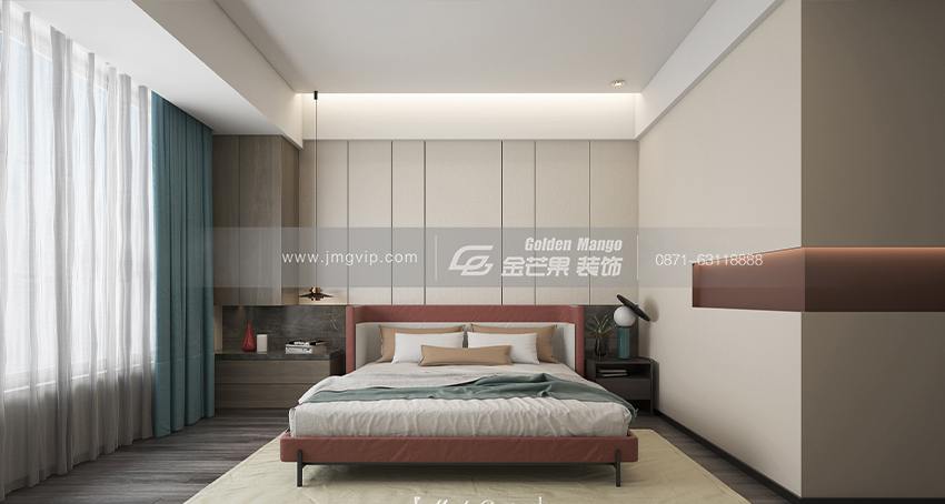 床體的顏色和客廳的顏色相互照應,包含式的床頭則有較強的安全感、更安心。運用視覺感強烈的線條元素進行搭配,墻體的設(shè)計則顯得藝術(shù)感十足。依舊沒有主燈的布置,以落地吊燈和桌面臺燈進行搭配。