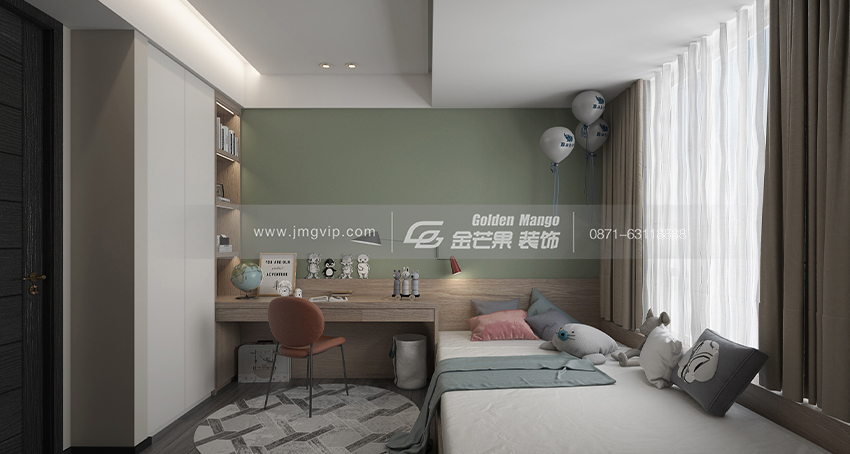 兒童房精巧布局,玩耍、休息、學習不耽誤。墻面一抹護眼的綠色加上沒有光線強烈燈的設(shè)計,顯得人性化,是設(shè)計的用心和精細的體現(xiàn)??蓯鄣牟寂及察o之夜陪伴于孩子的左右。