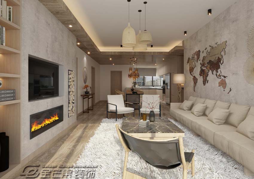 燈具的選擇十分考究,為了突出整體的風(fēng)格,選擇了光線柔和的燈具搭配。為了彌補(bǔ)主燈光線不足而局部光照不夠的問(wèn)題,加入射燈和燈帶來(lái)解決。地毯、沙發(fā)和爐火溫暖十足。背景墻上的世界版圖體現(xiàn)業(yè)主渴望游歷世界、關(guān)注天下事的心境。
