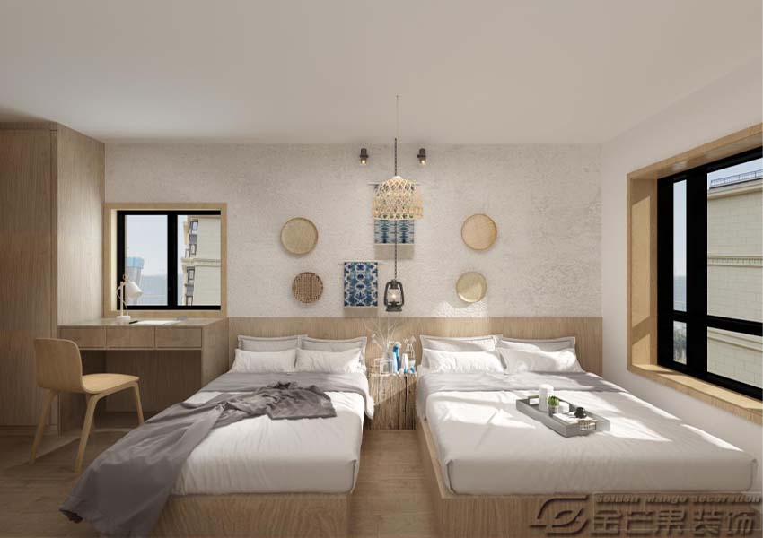 雙人床的布局,實(shí)用性更強(qiáng)。在親朋好友來(lái)訪時(shí)發(fā)揮著重要作用,以白色和梨木色相搭配,燈光柔和,有很好的休息體驗(yàn),實(shí)木的使用還原了自然風(fēng)的元素。