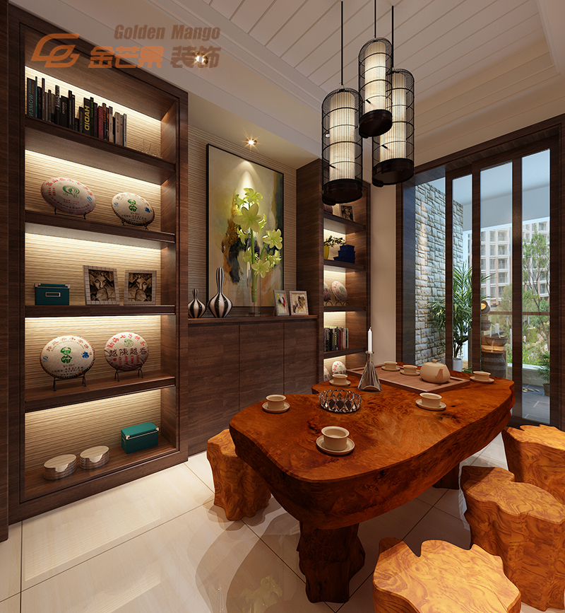 品茶區側重以中式風格為主,精心布置的茶桌和凳子也能看出,業主是一個好客之人,注重自身的修養和品德。喜歡收藏茶葉,這是對茶友最好的饋贈,聊天的閑暇之余也能欣賞窗外的美景。此時更顯得清新優雅。
