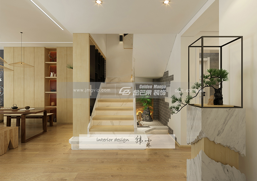 好客之心永存于心,對(duì)客人的尊重總是體現(xiàn)在方方面面,被珍藏的迎客松就是最好的體現(xiàn),被撐裂的底座有樹木茁壯成長的意味,更有共勉之意。樓梯下面也是一個(gè)小的生態(tài)圈,樓梯巧妙的和整體相搭配。