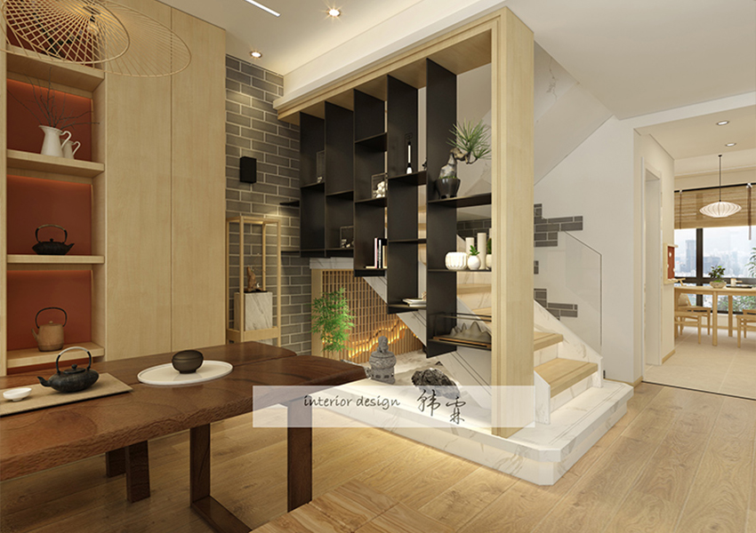 樓梯的一面采用鏤空的設(shè)計(jì),減少了上樓時(shí)的壓抑感覺,客廳、餐廳、品茶區(qū)之間沒有隔斷的處理,提升整體的聯(lián)系性。