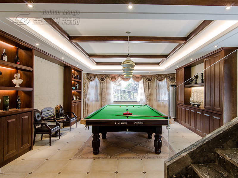 休閑、娛樂兩不誤,閑時和家人、朋友來兩局,增加相互之間的交流,增加生活的趣味性,高端和時尚。陳舊的木質柜體、瓷磚和歐式碎花窗簾更顯得古典風味十足。半圓形的窗子能更好欣賞窗外的風景,整個空間寬闊大方。