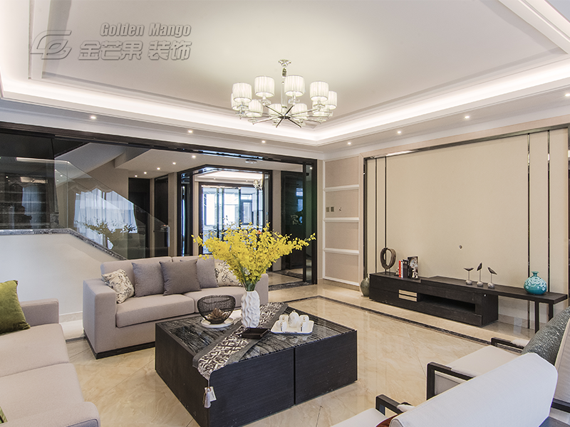 黑色金屬條包裹棱角,吊燈、射燈、燈帶相互搭配光線打亮屋子的每一個角落,電視背景墻以幾條線條感強烈的黑色金屬條搭配,簡約時尚。茶幾上一束小黃花顯得清新淡雅,在沙發的選擇上則是現代風格。