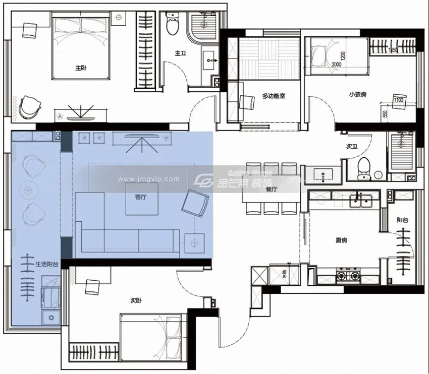 廚房把洗切和炒分離,增加空間的利用率,用推拉門隔斷,減少油煙的影響;餐廳和墻體規整布局;兒童房用實用性更強的高低床,滿足兩個孩子的使用;多功能室可作為學習、工作、活動區,也可以作為客房使用,加上次臥,完全滿足留客需求;入戶歸納鞋柜,衛生間干濕分離。