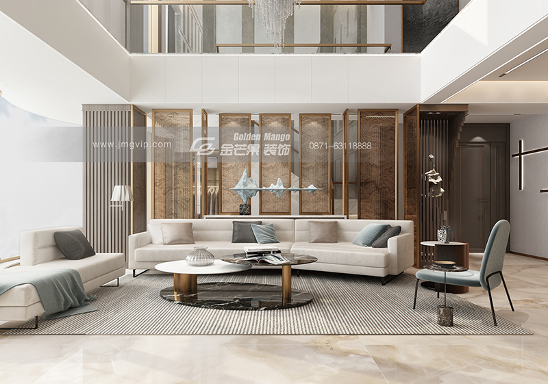 寬闊而不空曠的客廳空間,挑高的電視背景墻設計,隨性又自由。石材和金色鐵藝結合的茶幾,輕松打造奢華高級感。非常具有設計感的客廳大吊燈,如夢似幻,優雅大氣。