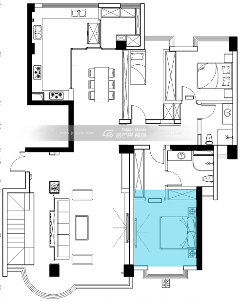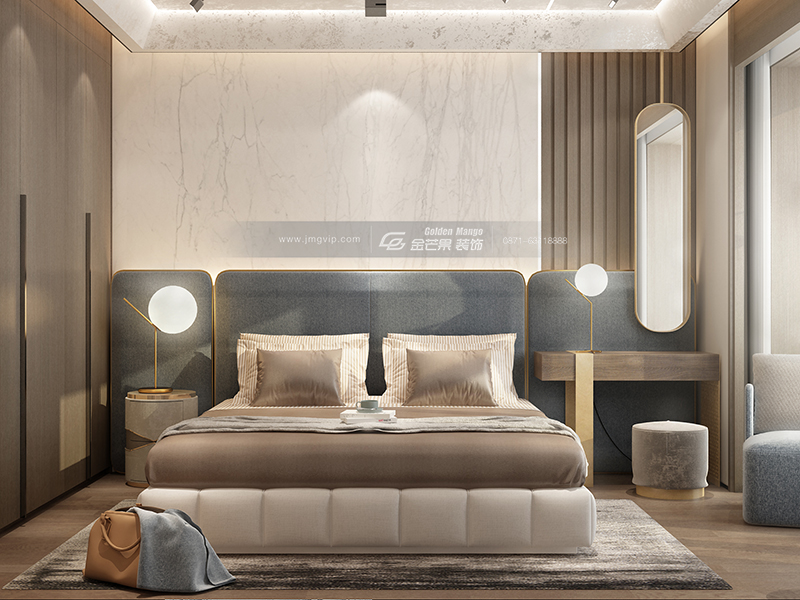 簡單,舒適,釋放身心的空間,區別于客餐廳棕色流金色調的營造,臥室以溫柔沉穩的白色調為主。銀色的線條精美氣質,營造輕奢感。純色的床具在光線照射下呈現如水般流動的絲滑感,奢華而不煩膩,貴氣而不張揚。簡潔的床頭背景墻一抹清新的藍色,成為了臥室中的亮點,溫潤彰顯,氣質有余。