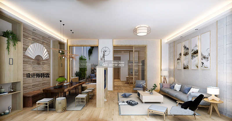 客廳整體空間以白色為主,搭配原木色的家具和地板,純色的地毯和布藝的沙發,營造雅致清逸的格調。選用大量的中國風元素,如電視背景墻上的折扇和沙發墻上的裝飾畫都是非常具有中國風元素的,仿若翩翩君子,遺世獨立。