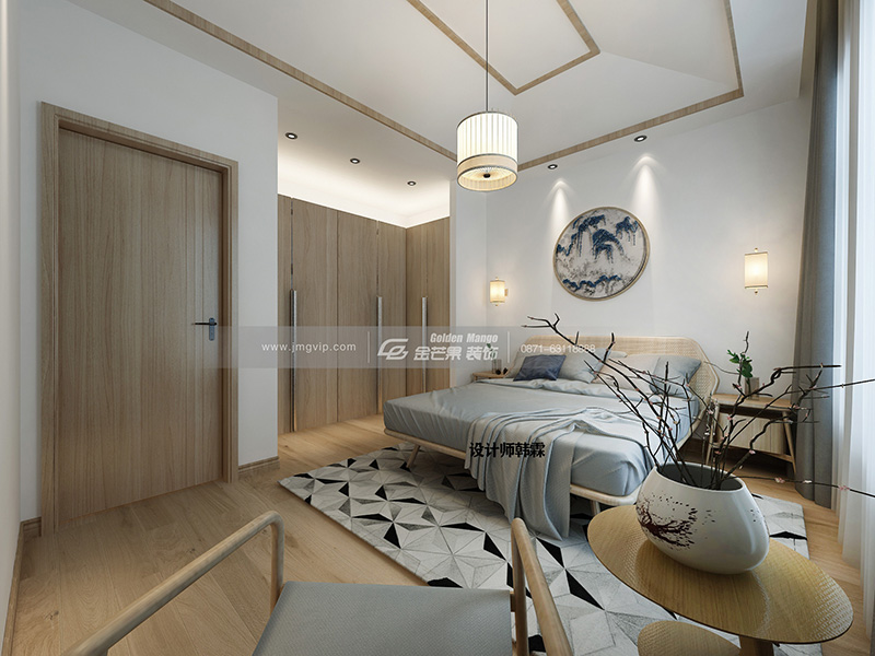 整體空間色彩仍是以淡色調為主,沒有過多的裝飾,為的是營造清雅的空間氛圍。地毯上的水墨圖案增加中國風的意境,主人可在此肆意潑墨揮毫。