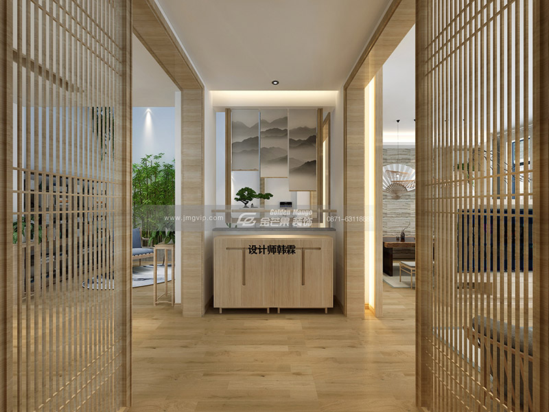 對稱的設計展現中國傳統的對稱之美,墻上的水墨裝飾畫使整個空間更加雅致。