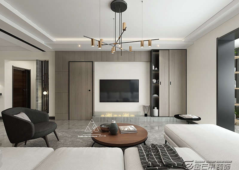 沙發背景墻的顏色,為整體空間增添了一些奢華和沉穩,避免黑白灰的過渡運用產生一種虛浮和冰冷感。木色電視背景墻和沙發背景墻呼應,是自然質樸與輕奢藝術的對話。