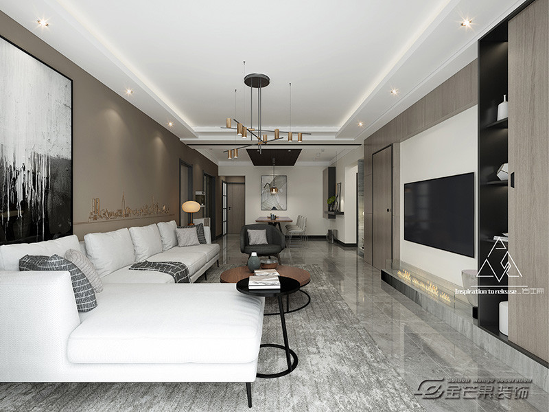 純白的沙發和電視背景墻,相互呼應的搭配下,留給業主一片純粹和遐想的空間,在這個喧囂的時代下,白色總是能給人帶來一種放松、簡單的溫馨感。