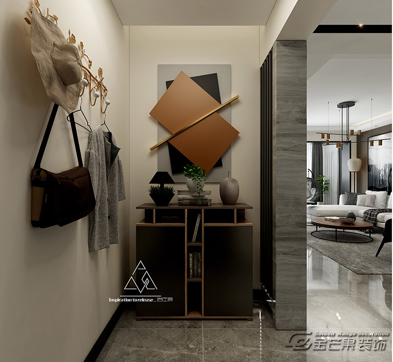 墻上的裝飾使入門出的點睛之筆,三色層疊拼接,點亮整體空間,充滿造型感,和柜體搭配營造精致、時尚的感覺。