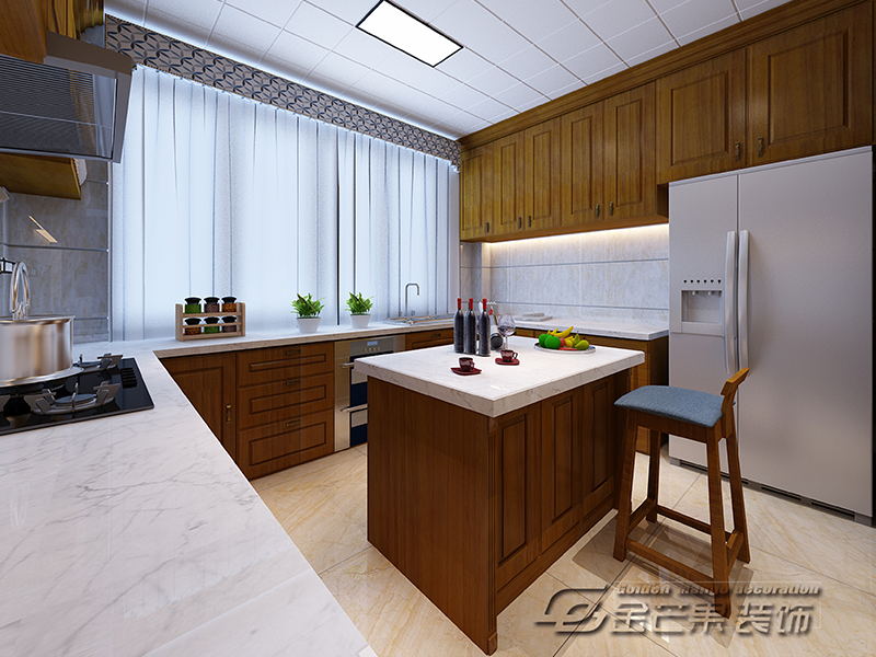 木材的櫥柜和石材的操作臺,穩(wěn)重不失時尚。寬闊的操作臺和冰箱非常實用,干凈簡潔。