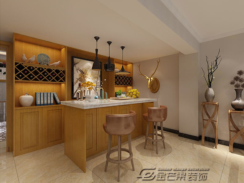 這里再一次實現(xiàn)了中西碰撞,西式的餐吧椅、吊燈、酒柜,搭配中式的選材和瓷器等擺件,非常具有特色。