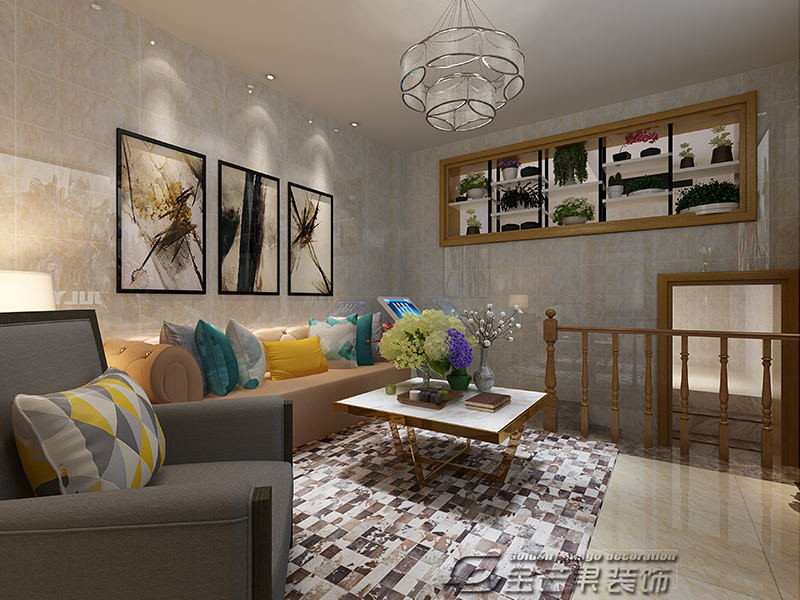 這是一個小型的客廳,整體空間大膽運用明艷張揚的色彩,使房間看起來很活潑,適合和親密的朋友一起聚會。墻上的裝飾畫令整個空間看起來更張揚但不夸張。桌子上的花束和墻上的鏤空花束增加房間的優(yōu)雅氛圍,和個性的裝飾畫互相碰撞、互相協(xié)調(diào),使整體上看上去非常舒服。