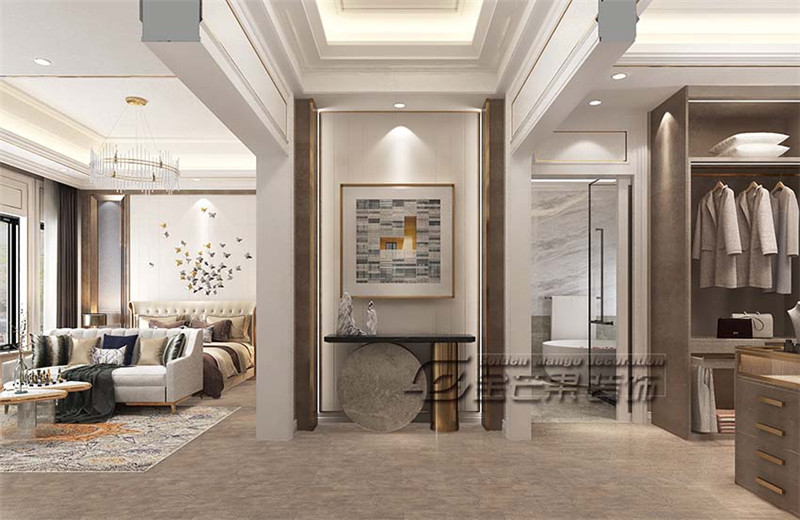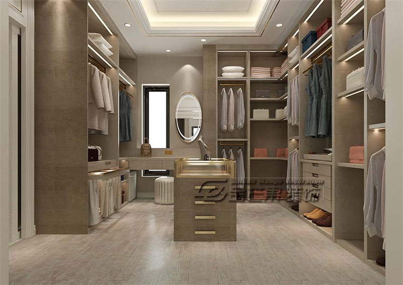 過道連接衣帽間和休息區,一家人準備出行,丈夫穿戴完畢悠閑的坐在沙發上喝茶看書,等待精心打扮的妻子,不時幫妻子提點建議,一個浪漫的畫面。