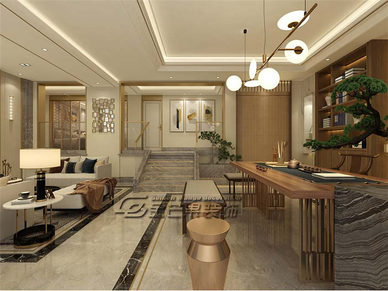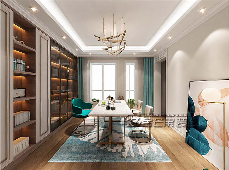 輕奢感的營造當然少不了鐵藝家具的運用,華貴的水晶燈既彰顯奢華的感覺,又可以比較好的照亮大面積開闊的空間。