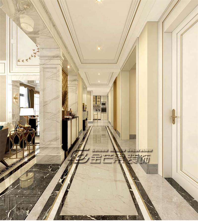 過道空間雖然簡潔,精心設計也可以成為充滿儀式感的空間。瓷磚鋪貼增加層次感,搭配兩邊的柱子自成一景。