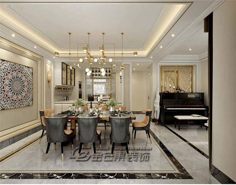 銀色和金色讓用餐變得高級,造型感十足的燈飾活潑、靈動,減少沉悶的感覺。裝飾畫展現線條的藝術,營造別樣的歐式風情。