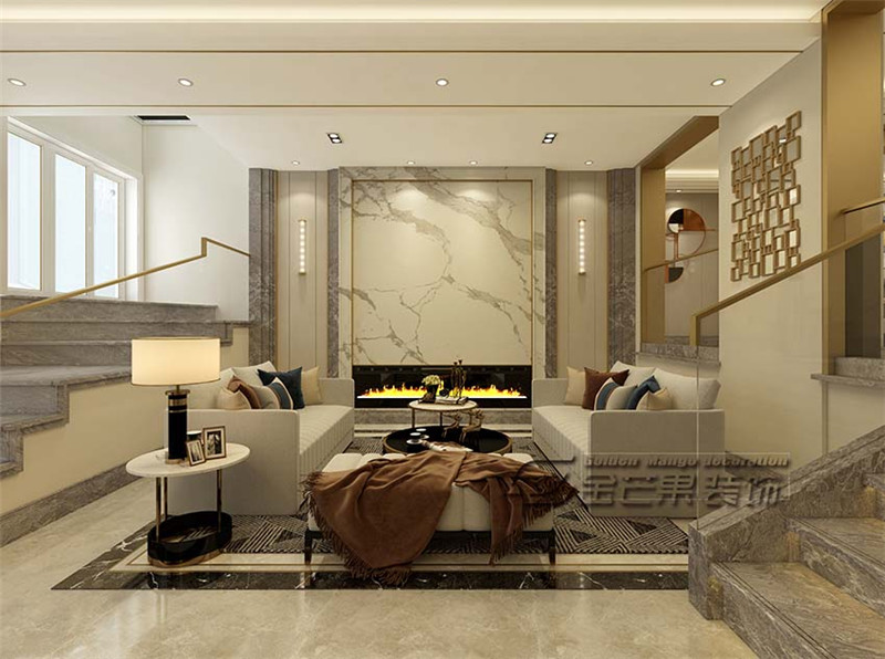 電視墻采用了大理石結合金屬線條的做法,輝煌大氣的造型,把整個客廳的基調定在了一個“貴”字上,典雅貴氣。