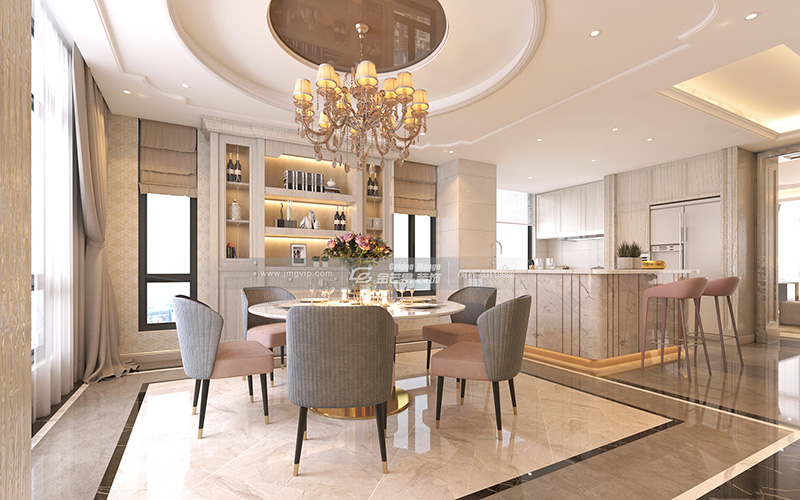 餐廳以白色為主,點綴粉色的家具,浪漫優(yōu)雅。清新的配色很溫馨舒適。
