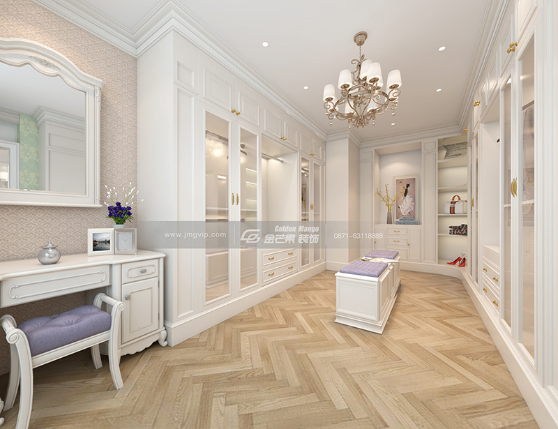 白色的柜體優(yōu)雅大氣,點綴紫色家具,和臥室相呼應(yīng)。輔助光源投下光線,和玻璃柜門反射的光交錯在一起,光影變換間營造華麗、儀式感滿滿的優(yōu)雅摩登生活,既有輕奢時尚范,又不失業(yè)主的精致與優(yōu)雅的生活品味。
