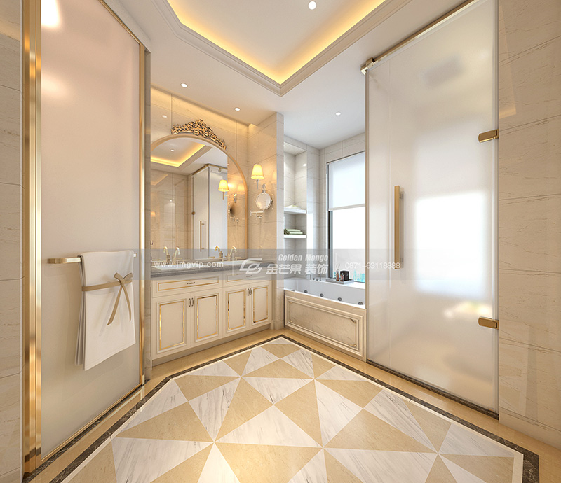 大面積的白色點綴金色,典雅奢華而不夸張。華貴的氛圍提升生活家居品質(zhì),磨砂質(zhì)感的玻璃既實用又高級。