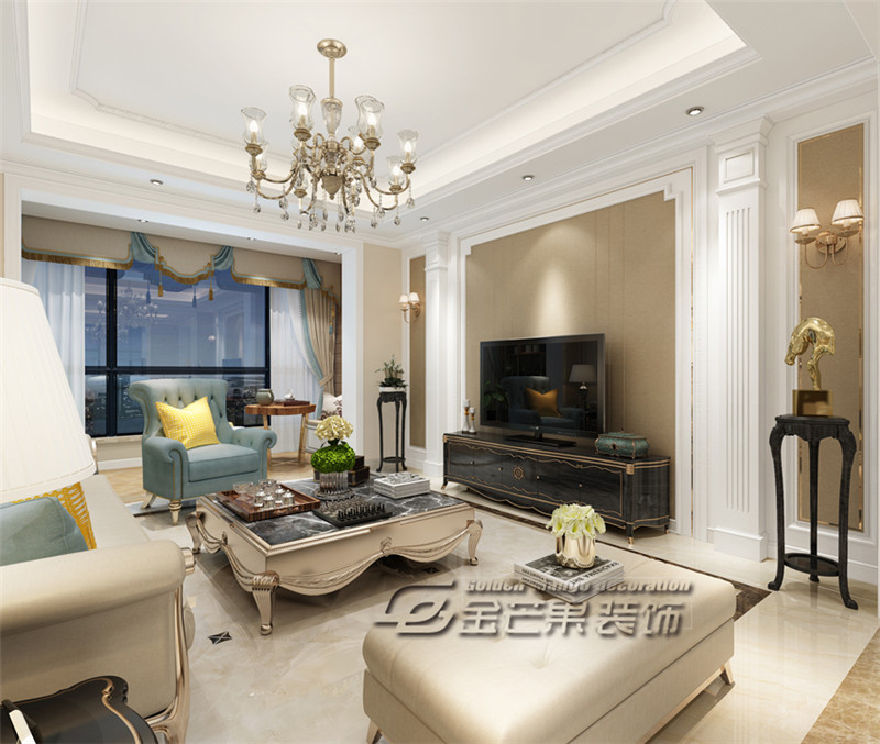 整體空間以象牙白為主色調,點綴一些亮色的家具,點亮整體空間,增加溫馨的感覺。歐式的家具鍍金鑲邊增加奢華感,水晶燈也是在歐式風格的塑造中常見的元素。鐵藝的家具和金色的擺件,營造尊貴典雅的感覺。宮廷風的窗簾也很好的貼合了歐式風格。