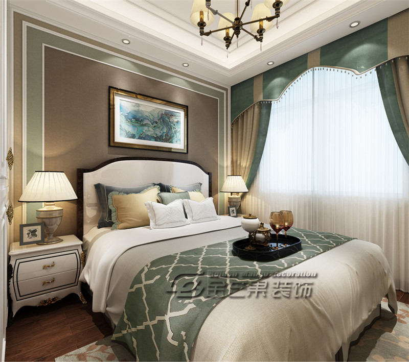 整體空間營造的是優雅、浪漫的感覺,歐式的床具搭配銀色的鑲邊,清新、精致又高貴。優雅的紫色和白色的窗簾相遇,溫柔、嫵媚。整體空間顏色搭配恰到好處,就像一杯加了奶糖的咖啡,香醇、甜美。