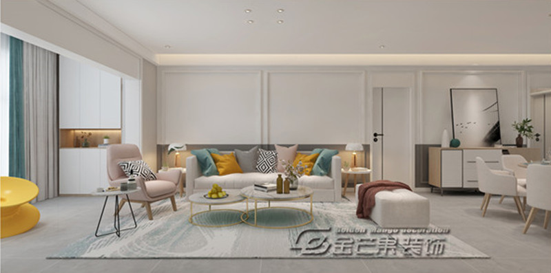 白灰拼接背景墻搭配簡約的石膏板走邊,簡約大氣而不單調。白色沙發上是色彩豐富的抱枕,冷靜中帶著些許俏皮。沙發兩側的矮幾上設計了兩盞小臺燈,暖黃色的燈光帶來一絲溫馨。