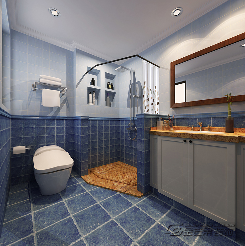 浴室整體空間以藍色為主,充滿個性,風格不羈但又不張揚。石材與木材的搭配讓空間不會因為藍色的過多運用而顯得冰冷,增加溫馨感。