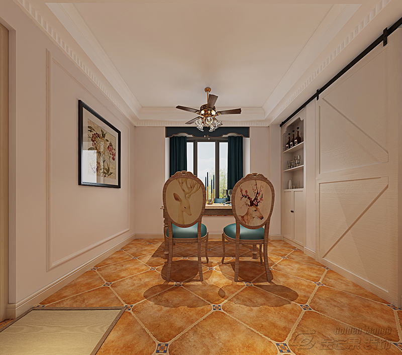 餐廳沒有過多的裝飾物,在空闊的環境中加一幅別有特色的壁畫,給人一種心曠神怡的感覺。富有美式氣息的餐座椅營造美式氛圍。