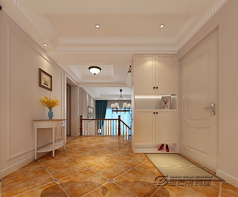 過道整體延續簡約、悠閑、大氣的風格,金黃色地磚和白色柜子時尚優雅,看似隨意其實品味不俗。