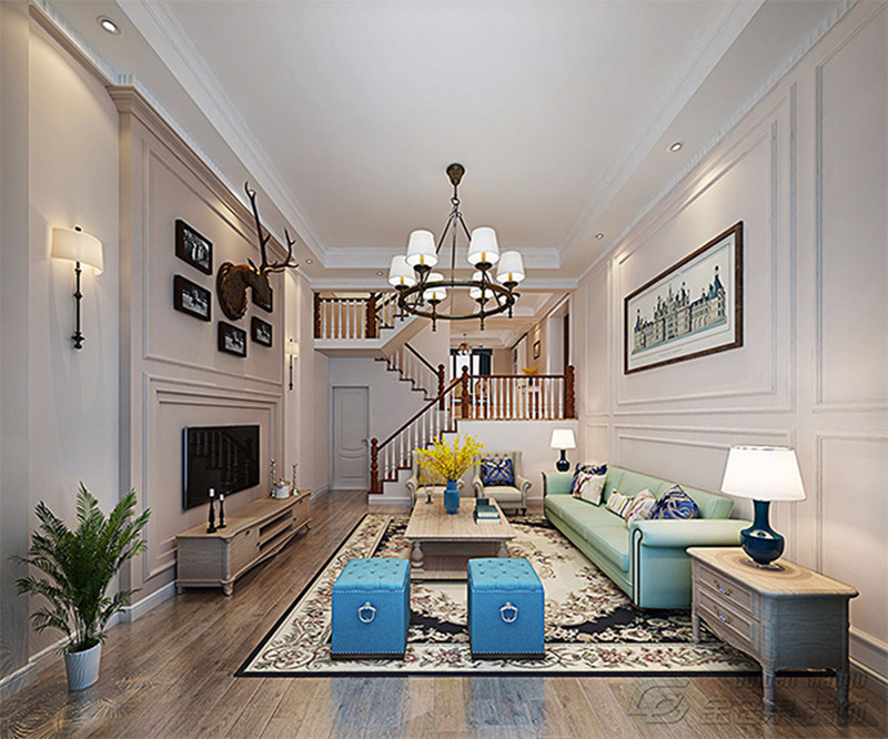 客廳作為待客區域,要求是簡潔明快的,同時裝修較其它空間要更明快光鮮。這個客廳整體空間以白色為主色調,點綴藍色的座椅,明快不失靚麗。美式的家具搭配一些具有歷史感的裝飾畫、地毯,使客廳寬敞而富有歷史氣息。
