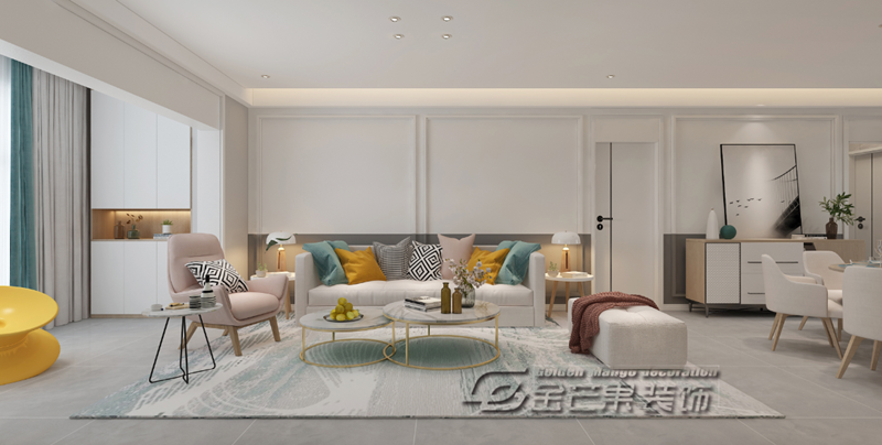 沙發(fā)背景墻以暖白色為主,凸起的方形石膏線條走邊讓普通墻體瞬間高級起來;暖白色沙發(fā)上井然有序的擺放著莫蘭迪綠,橙黃,皮粉等色彩明艷的抱枕作為點(diǎn)綴。吊頂邊緣嵌入式暗燈帶的設(shè)計使得客廳明亮通透,光線柔和不刺眼。