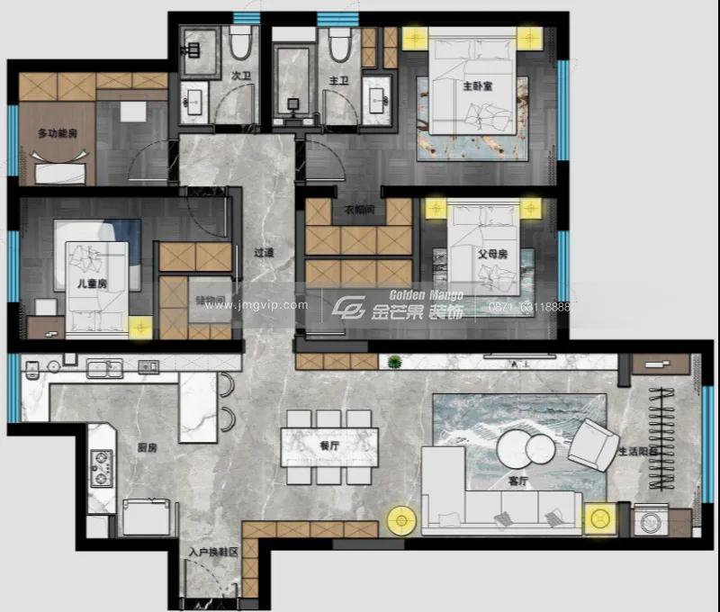 入戶鞋柜,儲物柜的設計,兼顧收納和展示功能;將小陽臺的空間并進廚房里增大了廚房的空間,開放式廚房以及小島臺的設計充分利用空間,大氣美觀;主臥床頭兩邊做了兩個小床頭柜,主臥與主衛墻邊嵌入式的柜子設計既美觀又很好的利用了空間,主衛干濕分離,空間合理;利用次臥(兒童房)的部分空間將儲物間的空間變得更大,利用次臥(父母房)的部分空間設計了獨立的衣帽間,收納功能大實用性強;獨立的書房,榻榻米和儲物柜的設計滿足了多功能的需求。