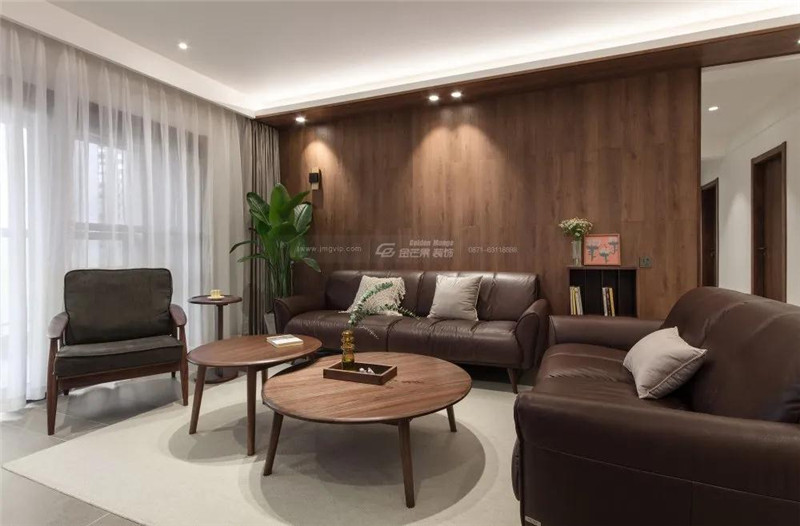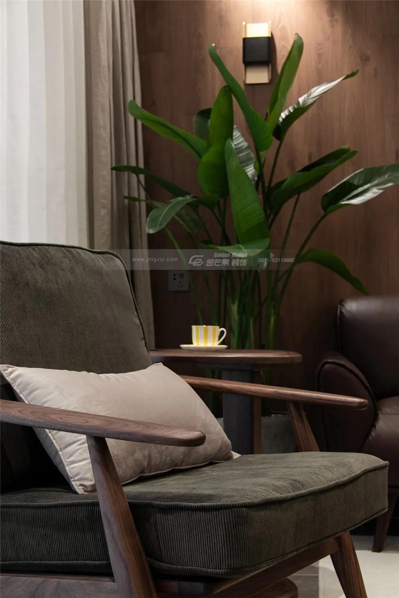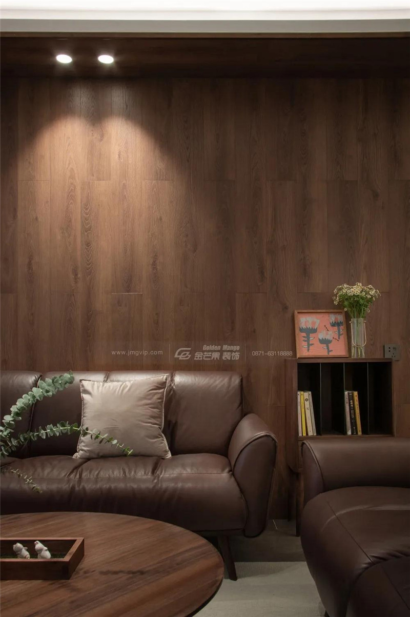 一整面的木質沙發背景墻,讓半夏的慵懶時光有了更大的發揮空間,如同走進了一片綠林,清新且靜謐。
