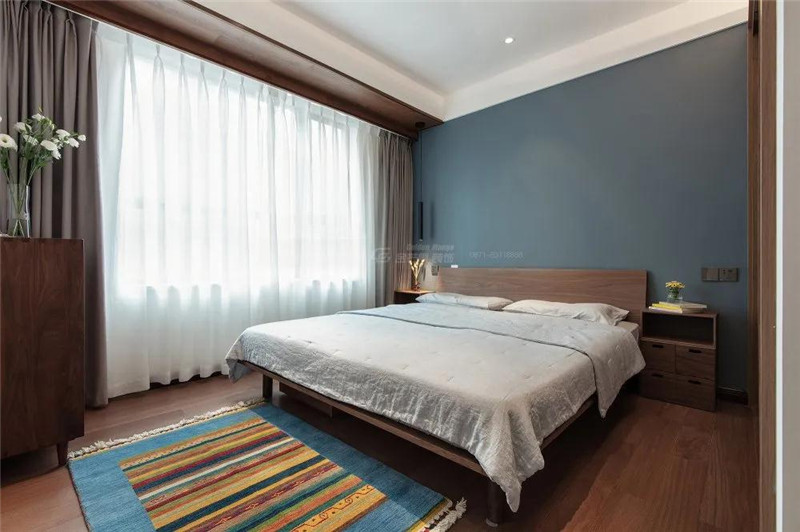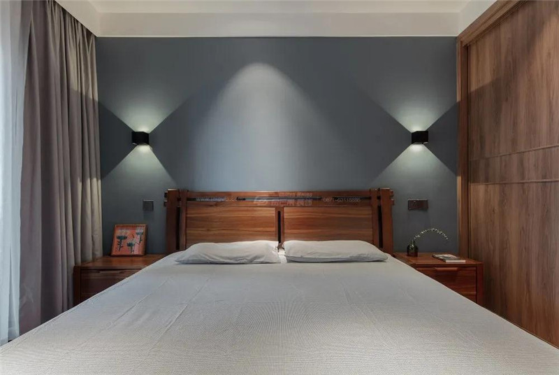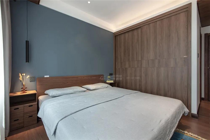 臥室同樣選用了木質家具,打造隨性且放松的慵懶空間。簡潔的墻面和柜體沒有過多的裝飾,選用個性的燈具打造出花紋和層次感。