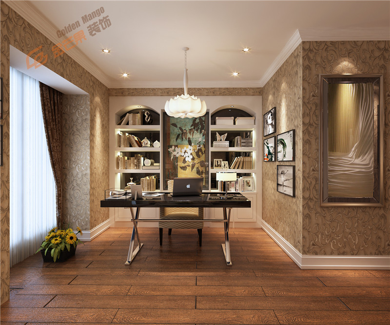 鏤空的書架有設計感又實用,帶花紋的壁紙增加空間奢華感,裝飾畫營造西方古典氛圍。