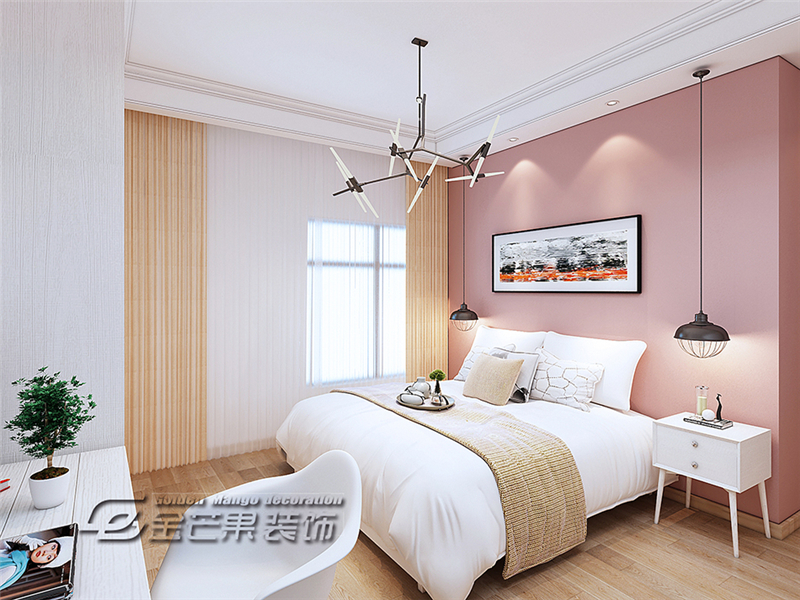 粉色的墻面和黃色的窗簾搭配,活潑明麗的顏色。燈飾很有藝術(shù)感,兩邊的床頭吊燈增加幾分慵懶的感覺。