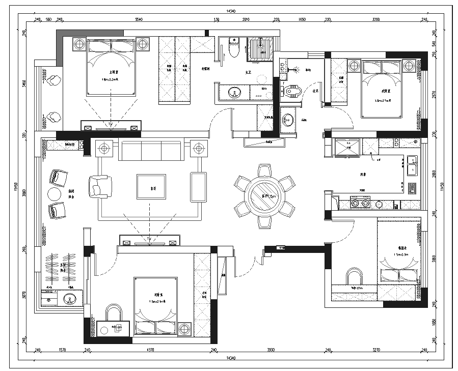 1. 入戶位置對(duì)臥室門(mén)的問(wèn)題,通過(guò)調(diào)整主臥室的門(mén)洞位置,達(dá)到趨利避害的目的,讓入戶第一眼看到的是餐廳背景這一個(gè)景。
