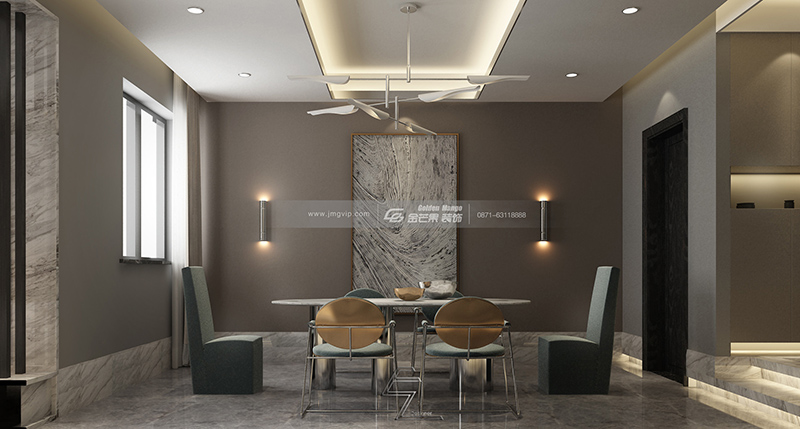 灰色和棕色的搭配,大氣又有韻味,優雅的金色和綠色讓整個空間變得優雅、浪漫。精致的餐桌椅讓原本平凡的用餐時間也可以變得充滿儀式感。