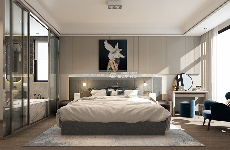 整體空間是以灰白色調為主,優雅的藍色座椅和圓形的鏡子,就像是闖入了電視劇中的女主角,空氣中是優雅的香水味。浴室和臥室的搭配有情調又個性,同時也增加了房間的高級感。
